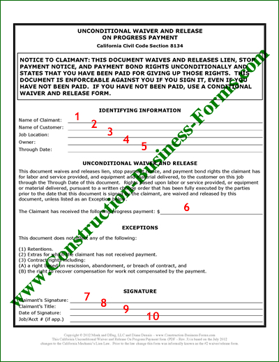First an image of the California #2 Unconditional Lien Waiver and Release Upon Progress Payment form - with reference numbers assigned to the sections… :o)
