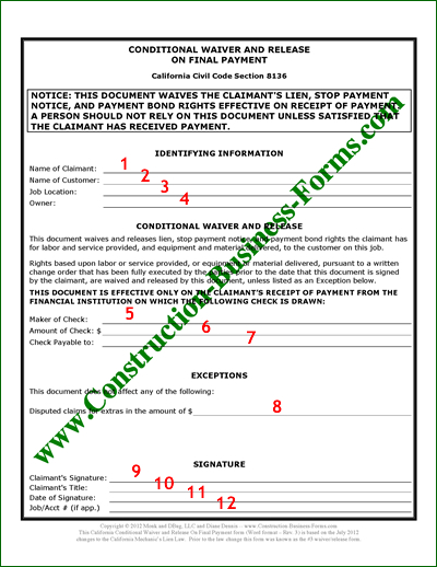 The old law vs. the new lawThe way the California Civil law was written (3262(d)(3) before it was replaced in 2012 with CCV-8136), if you signed the #3 release form and there was even just one open issue/dispute you still released your lien rights to all work performed (typically including those disputed items) on the project once you'd been paid the dollar amount that you indicated.